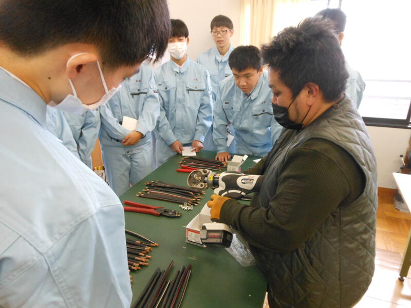 12月2日(火) 電気科1年生を対象に専門学科講師派遣による授業を実施しました。当日は群馬県電気工事工業組合から9名の先生を派遣していただき、電気工事の現場で活躍する方々から実践的な技術を教えていただきました。地元で活躍するプロフェッショナルが講師として参加していただき、生徒達も熱心に取り組んでいました。また、学校には無い工具なども体験することができ、楽しく勉強することができました。