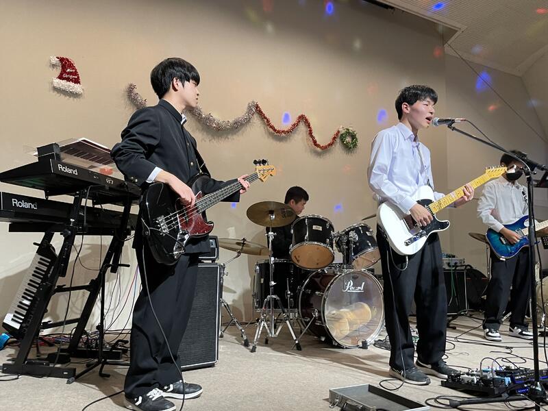 屋内ステージでは、軽音楽部のサワークリームオニオンズが出演しました。手拍子も混じる温かい雰囲気のなか3曲披露しました。