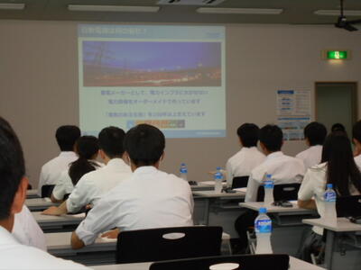 日新電機㈱前橋製作所では、変電所等で実際に使われるGISの製造現場を、材料の加工・組み立てから最終の検査まで先輩方の案内で見学しました。見学後の先輩方との質疑応答では、ものづくりの魅力や職場環境の良さを実感できました。