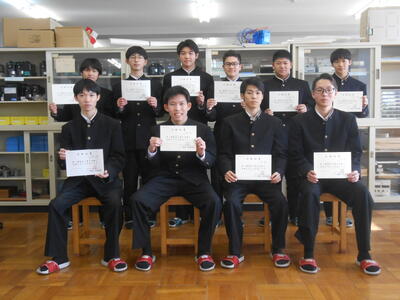 令和7年度第一種電気工事士試験において、電気科の2年生6名と3年生5名の計11名が合格しました。(写真はその内の10名)また電気科3年生は昨年度の合格者と合わせて、卒業までに13名が第一種電気工事士試験に合格したことになります。毎年県内上位の合格者を出しています。