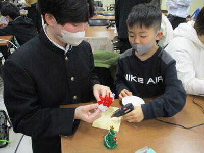 当日は、使用済み封筒で作るクリスマスツリー、DVDを使ったコマ、使用済み葉書を使ったグライダーづくりに挑戦しました。生徒たちは、小学生に作り方を丁寧に教えながら交流を深め、会場は終始、笑顔と活気にあふれました。