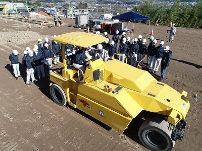 わざわざ工事を止めて、試乗させていただきました。慣れない高い目線や複雑な操作レバーもさることながら、タブレットやGPSで管理された最新の工事車両を体験することができました。